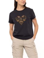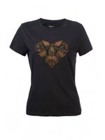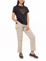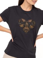 Camiseta de cuello redondo y manga corta, confeccionada con suave algodón orgánico y con un detalle de corazón tejido delicadamente con pedrería en colores dorados y cobres, que le otorga un estilo único y sofisticado. Una prenda ideal para lucir en cualquier ocasión y con la que te sentirás conectada a la naturaleza y a los materiales orgánicos que utilizamos en su fabricación.